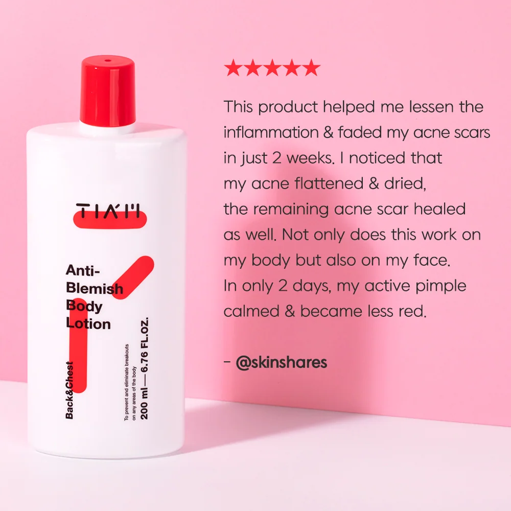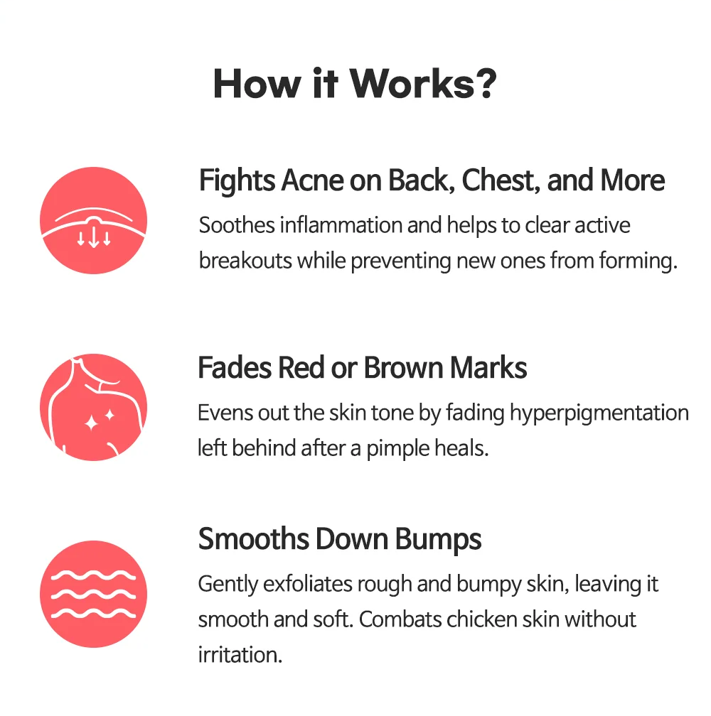 What it is & what it does: A lightweight, fast-absorbing body lotion that treats body acne, brightens post-acne marks and soothes irritated skin.