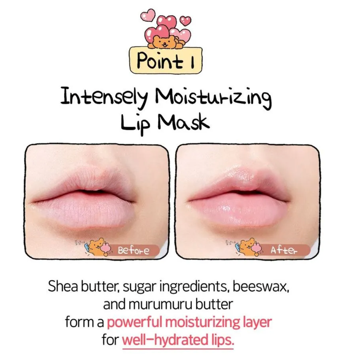 - A limited edition ETUDE x Bearkku 2-in-1 sleeping pack and lip balm to rejuvenate dry and chapped lips without stickiness