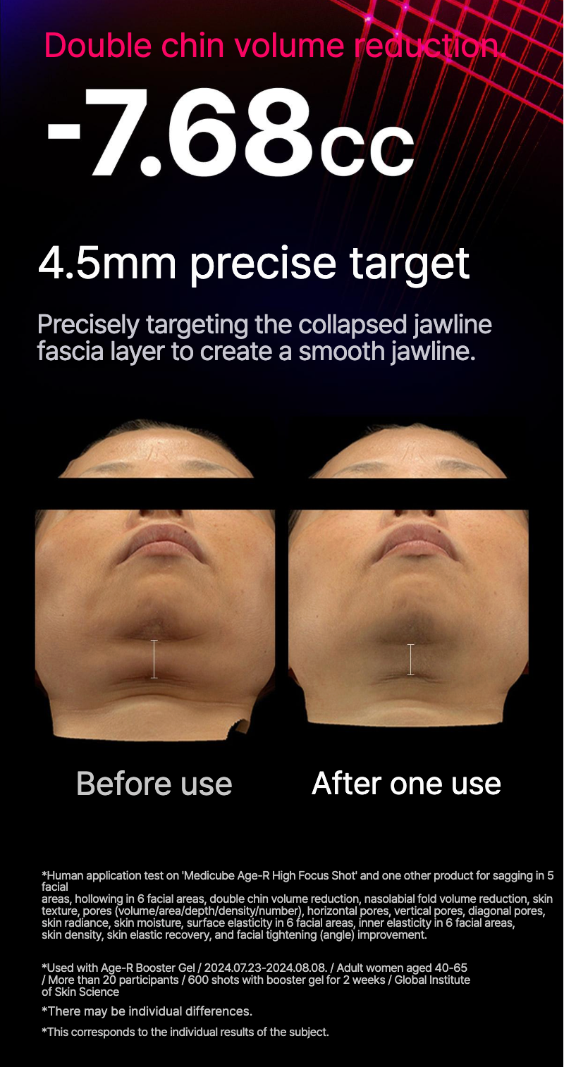 Deep skin rejuvenation: Targets the Fascia (SMAS) layer at 4.5mm deep to support the deeper structure rather than just the surface — helping to tighten and improbe overall skin elasticity