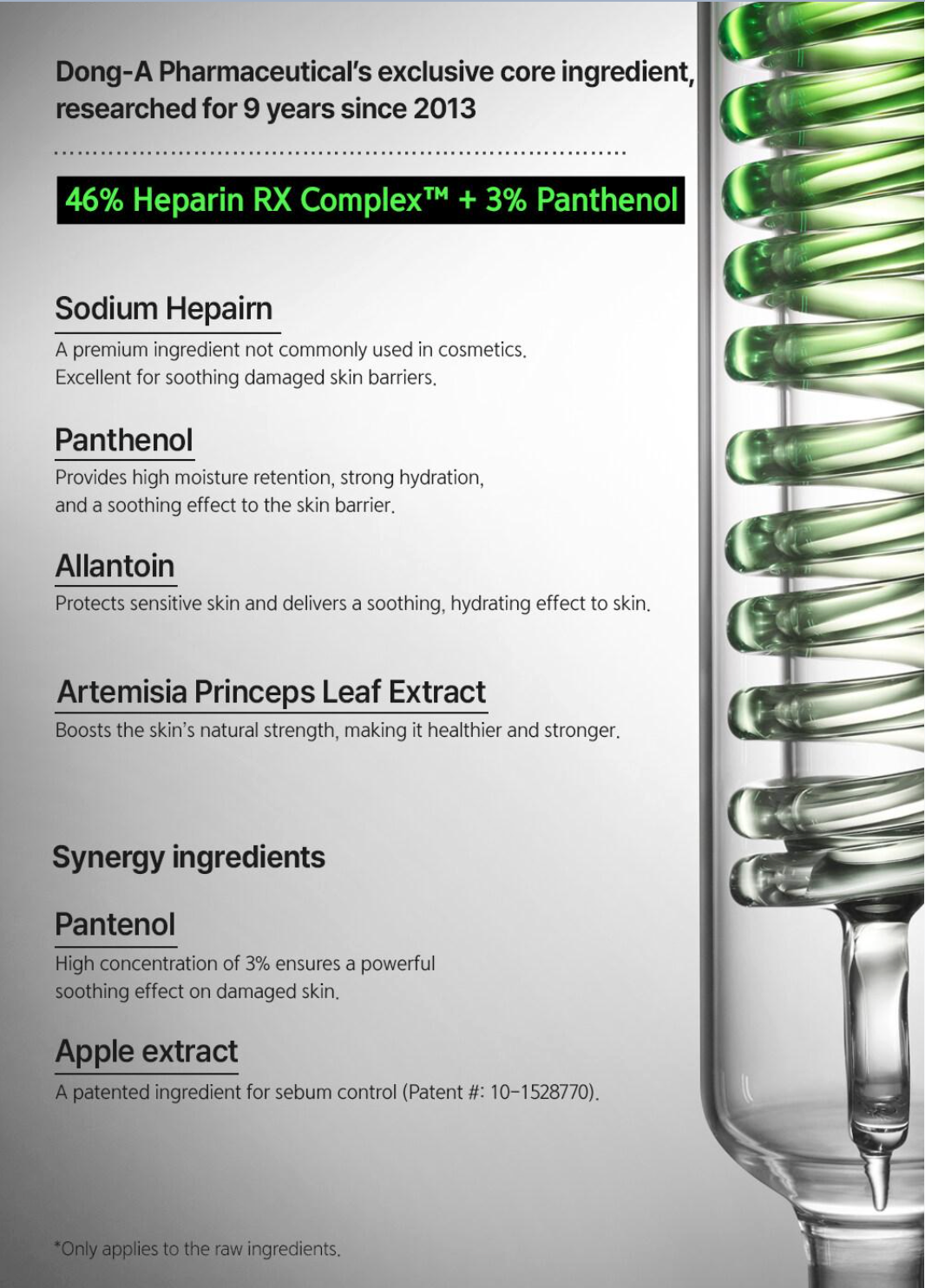 - Developed by Dong-A Pharmaceutical: The formula centres on Heparin RX Complex™, a proprietary soothing blend developed over 9 years of research by Dong-A Pharm, a major pharmaceutical company in South Korea.