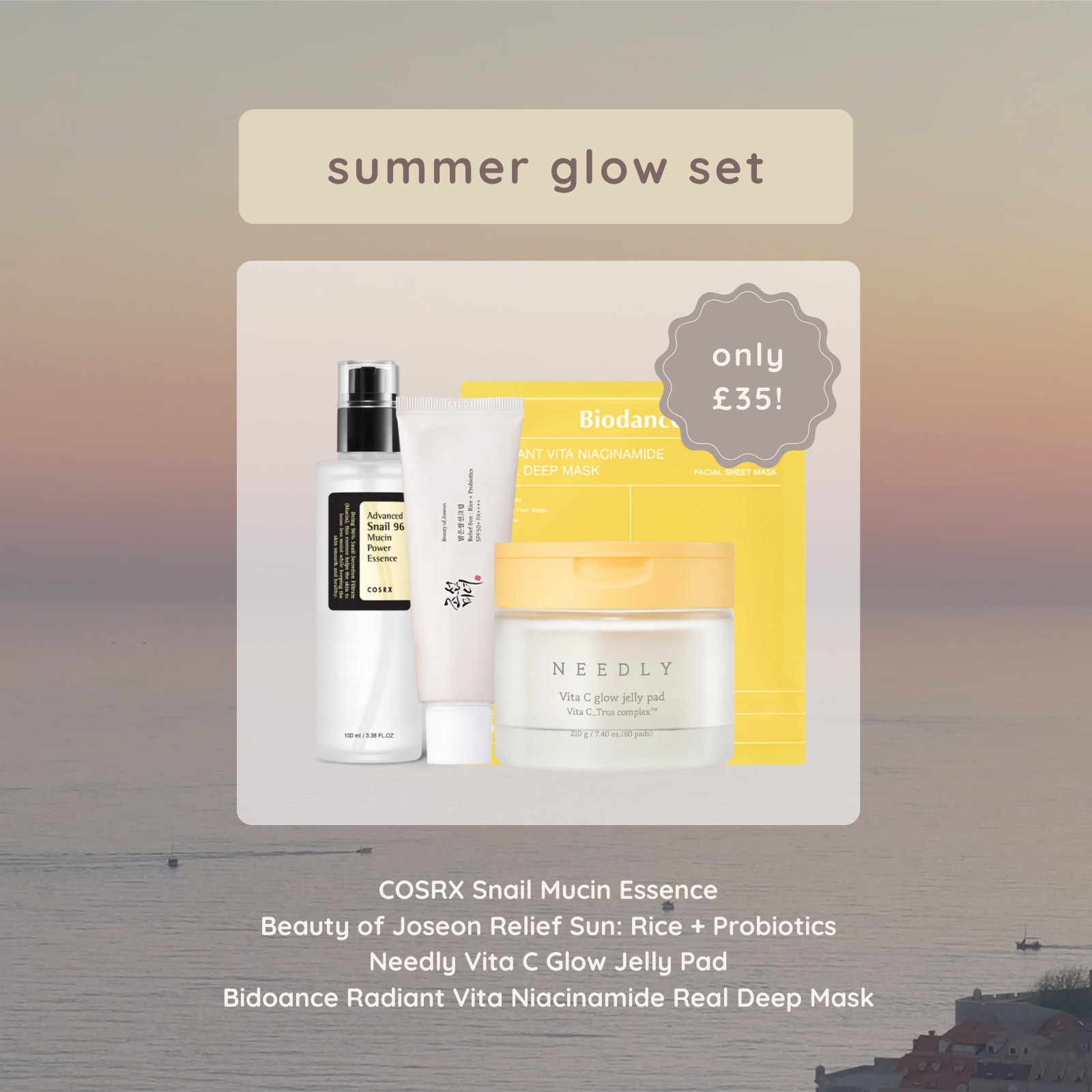 Say goodbye to dull skin and hello to radiant, healthy glow with our curated Summer Glow Set. Perfect for refreshing your routine as the seasons change, this limited-edition bundle brings together four K-beauty essentials designed to hydrate, brighten, and protect your skin as summer winds down.